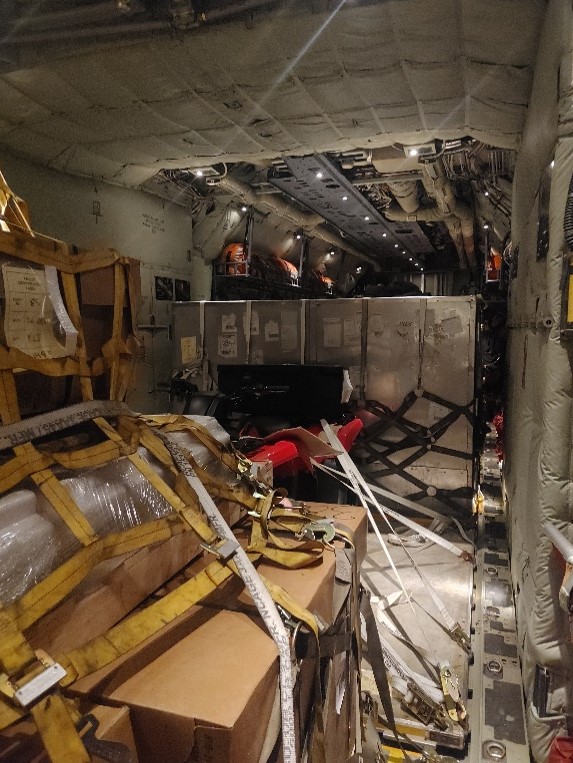 Around an hour in, the load master let us know it was alright to unbuckle and move around. Almost immediately everyone claimed a place to lay down on the cargo or on the empty seats leaving me to find a small nook next to a secured new Honda ATV. I mostly watched the windows once the sun rose enough to see anything or looked around taking in the sights of the plane like the beige curtain concealing the portapotty or the thousands of pounds of cargo towering behind me.