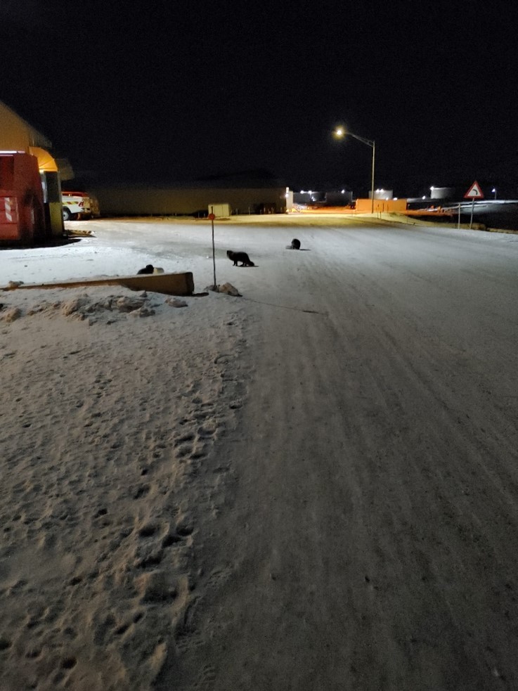 Arctic Foxes have two colour morphs. A well-known white morph. The famous white arctic fox, perfectly suited for the arctic with a snow-white coat in the colder months and a brown-sandy coat in the summer. Apparently, from my google search after I got back, a blue morph also exists. While they seem to be common here, I think they are slightly rarer in general to the white morph. They aren’t blue, but black or a sooty-grey and stay that colour year-round. I am sure they are quite successful in the dark months around the Pituffik dining hall garbage bins.