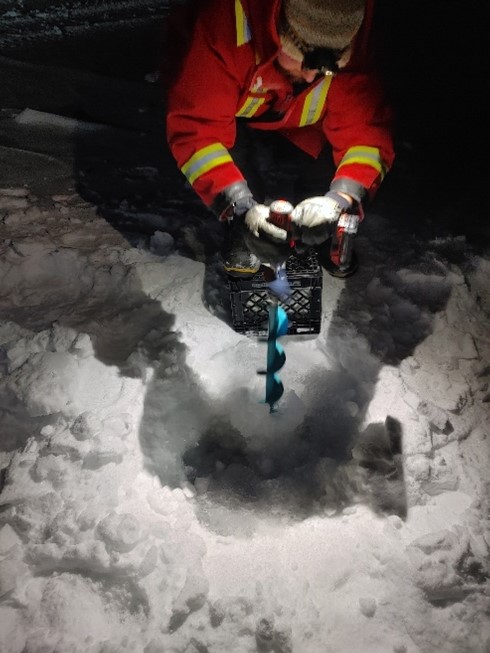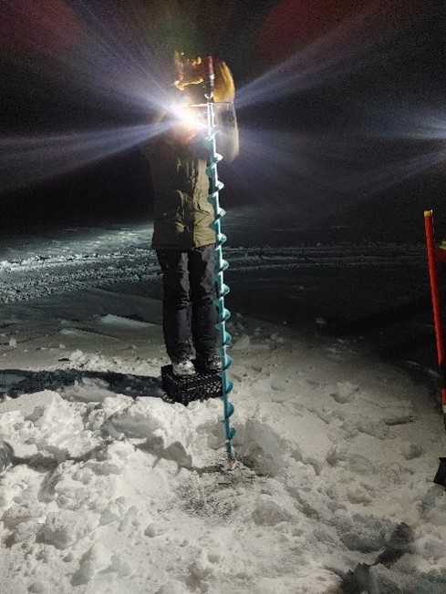 We drilled into the ice under the full moon, and once through, a small metal probe attached to wire and a measuring tape is led through the hole to catch on the bottom to measure the depth (approx. 2m).
