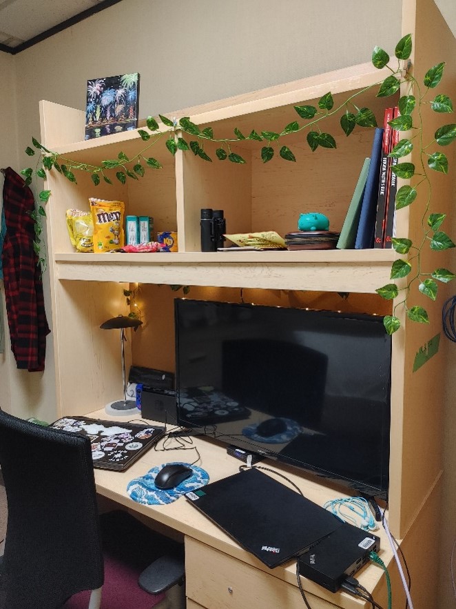 My snack trove, and tech site. I am given a laptop connected to the military monitored internet called GPNet. I use it mostly for social media and playing music, so I hope whoever watches from behind the screen likes Weezer.