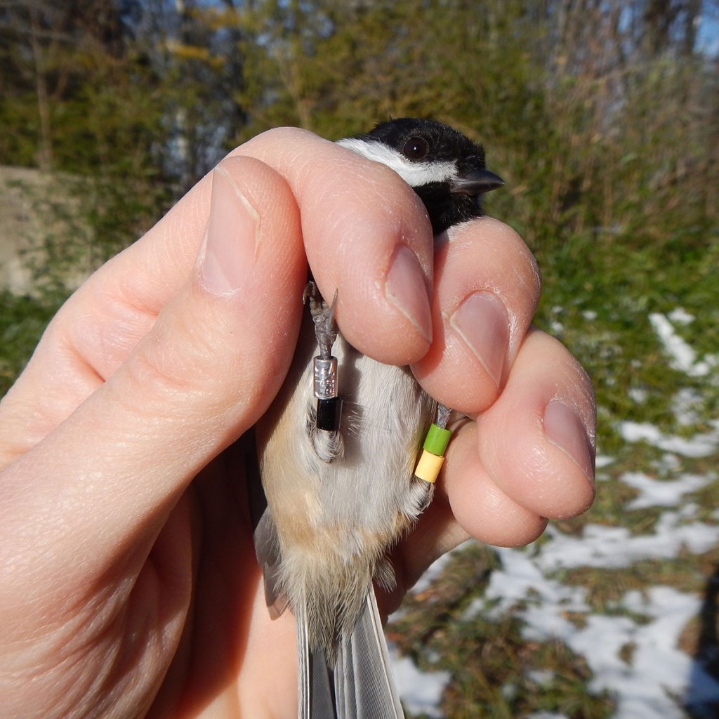 This is a chickadee that was banded at the University of Guelph (not related to this project). If I saw this bird in Suffield, I’d read its ID as YGBA (Yellow, Green, Black, Aluminum).