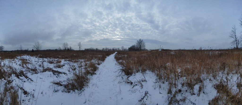 The Meadow Trail cuts through a large expanse of meadow and grassland that lies relatively dormant this time of year, but still shows signs of life of small paw prints and the occasional flutter of birds from the surrounding trees. Scattered throughout the gentle hills are odd snow mounds probably formed by the wind and accumulation of snow over time, but they definitely stick out amongst the dead grass and dusting of snow over the ground.