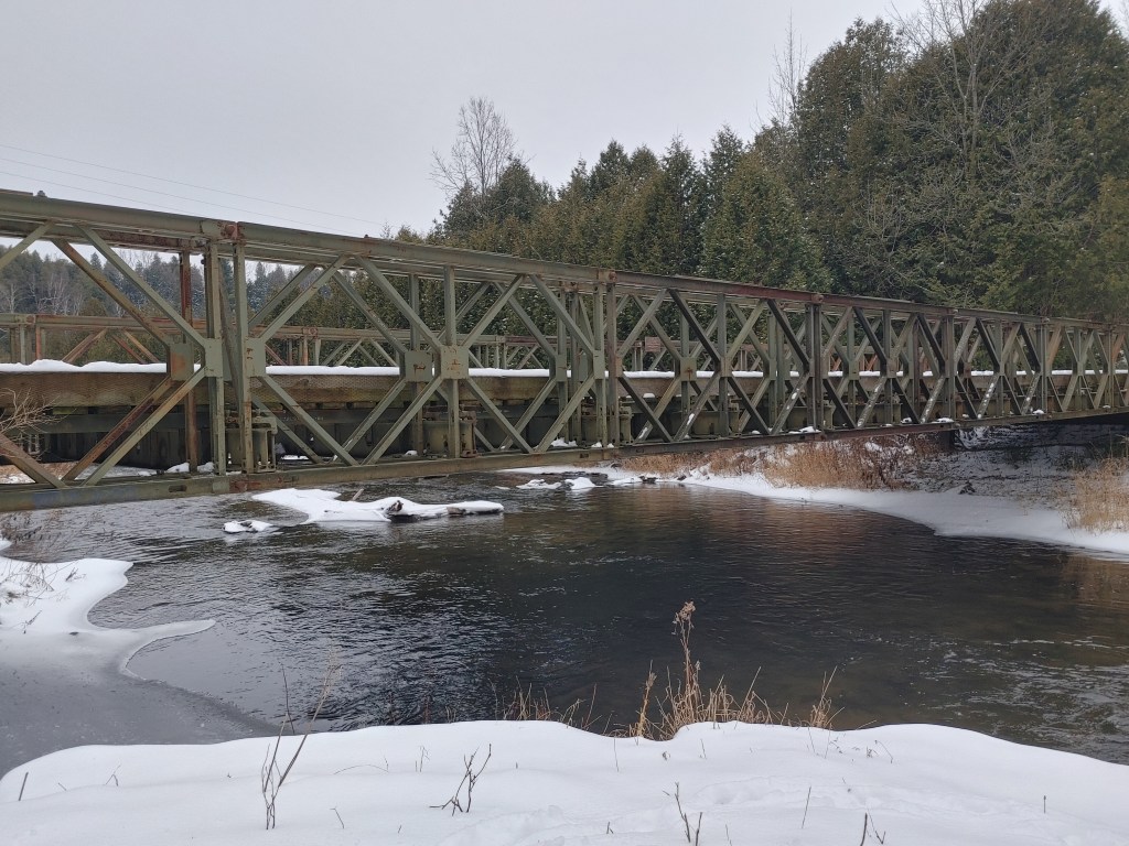 Further down the trail, away from my roadblock, is The Bailey Bridge, built by the Canadian 2nd Engineering Regiment in 1999 as a pedestrian footbridge to connect both ends of the Meadow Trail. I sat here and ate my clementine that I had received for Christmas while watching some ducks further downstream.