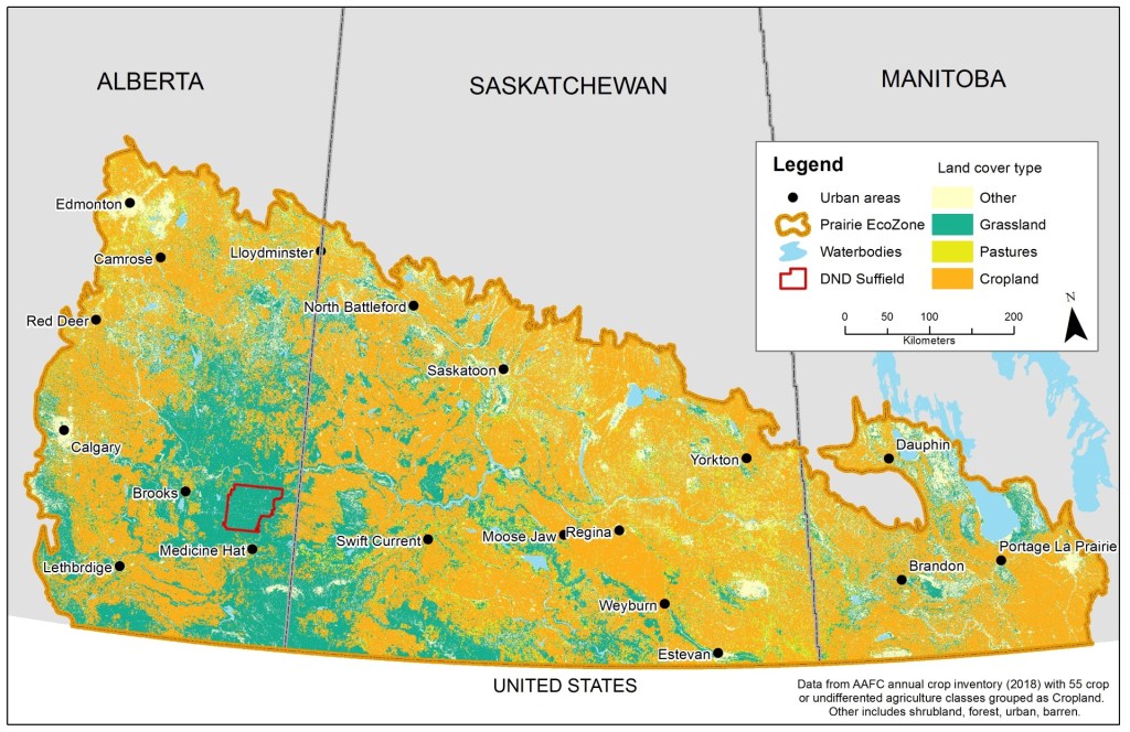 The Suffield National Wildlife Area is one of the last stretches of undisturbed grassland prairie from industrial agriculture – creating a safe haven for many endangered and threatened species including many birds species such as the Horned Lark and Burrowing Owl. With the extirpation of the wild buffalo herds, cattle are brought every summer to graze as to support the health of the native prairie.